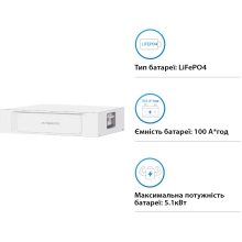 Технологія LiFePO4 — це гарантія довговічності та безпеки. Ємність 5.12 кВт⋅год при номінальній напрузі 51.2 V робить модель сумісною з високовольтними рішеннями. Робочий діапазон напруги від 44.8 до 58.4 V забезпечує стабільність навіть при коливаннях навантаження. Акумулятор розрахований на 6000 циклів — це роки надійної роботи без втрати ефективності. Струм відключення 100 А та відсутність потреби у зовнішньому BMS спрощують інтеграцію й прискорюють монтаж. Це продукт, створений для довгої, стабільної та ефективної служби.