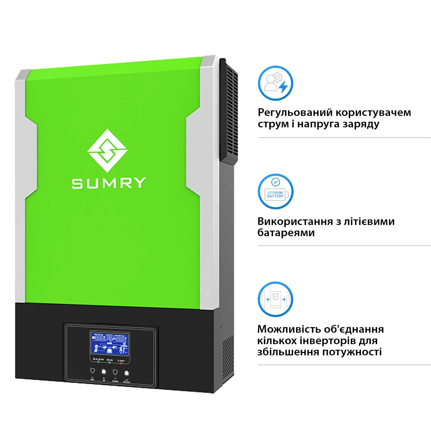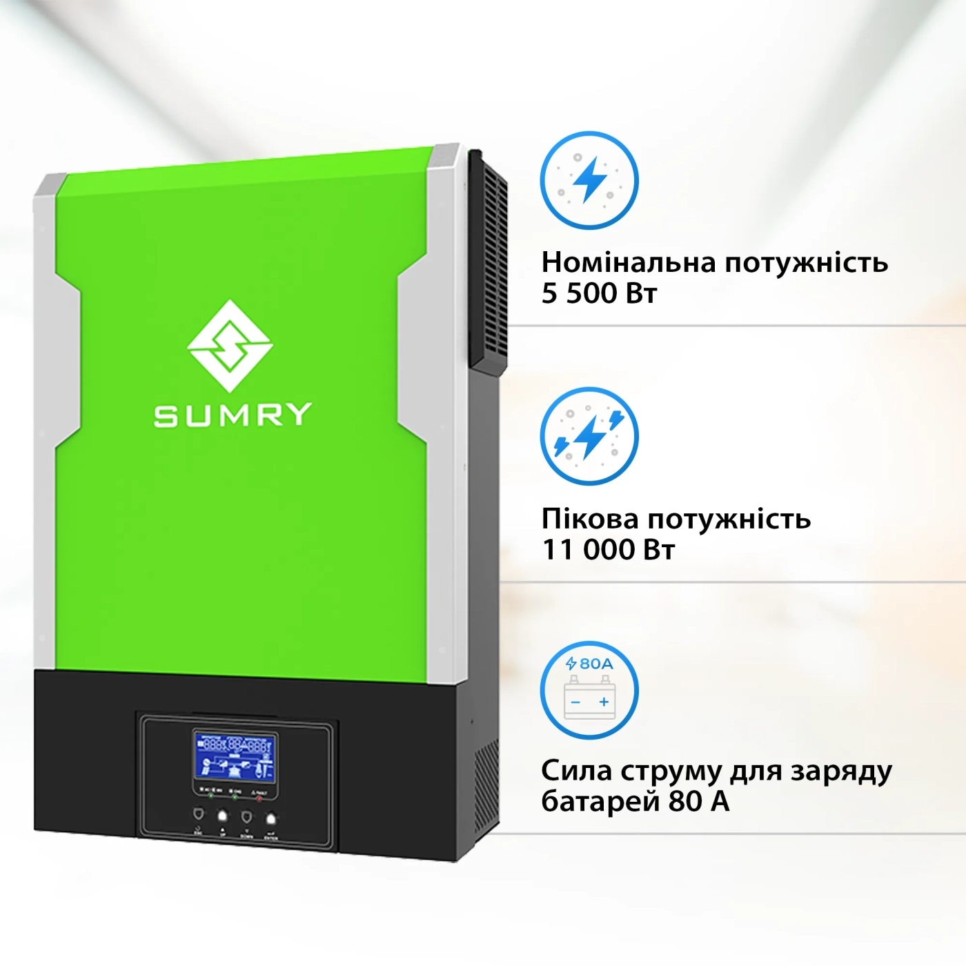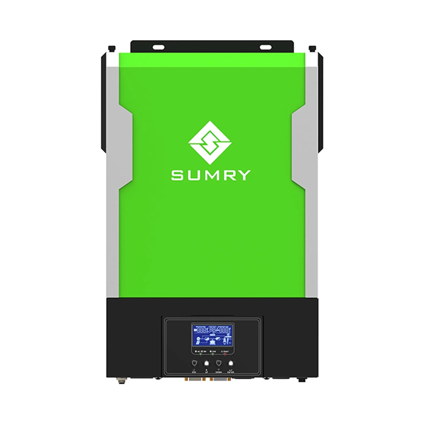 Автономний сонячний інвертор SUMRY HGP-5500W PRO є проривним рішенням в галузі сонячної енергії, що поєднує передові технології та високу функціональність для забезпечення надійного та ефективного електропостачання. З максимальною потужністю 5500 Вт, цей інвертор здатний перетворювати постійний струм, що отримується від сонячних панелей, на змінний, що робить його ідеальним як для домашнього, так і для промислового використання. Його відмінною особливістю є можливість об'єднання до шести таких пристроїв у єдину потужну систему, що забезпечує вражаючу масштабованість та гнучкість у застосуванні.