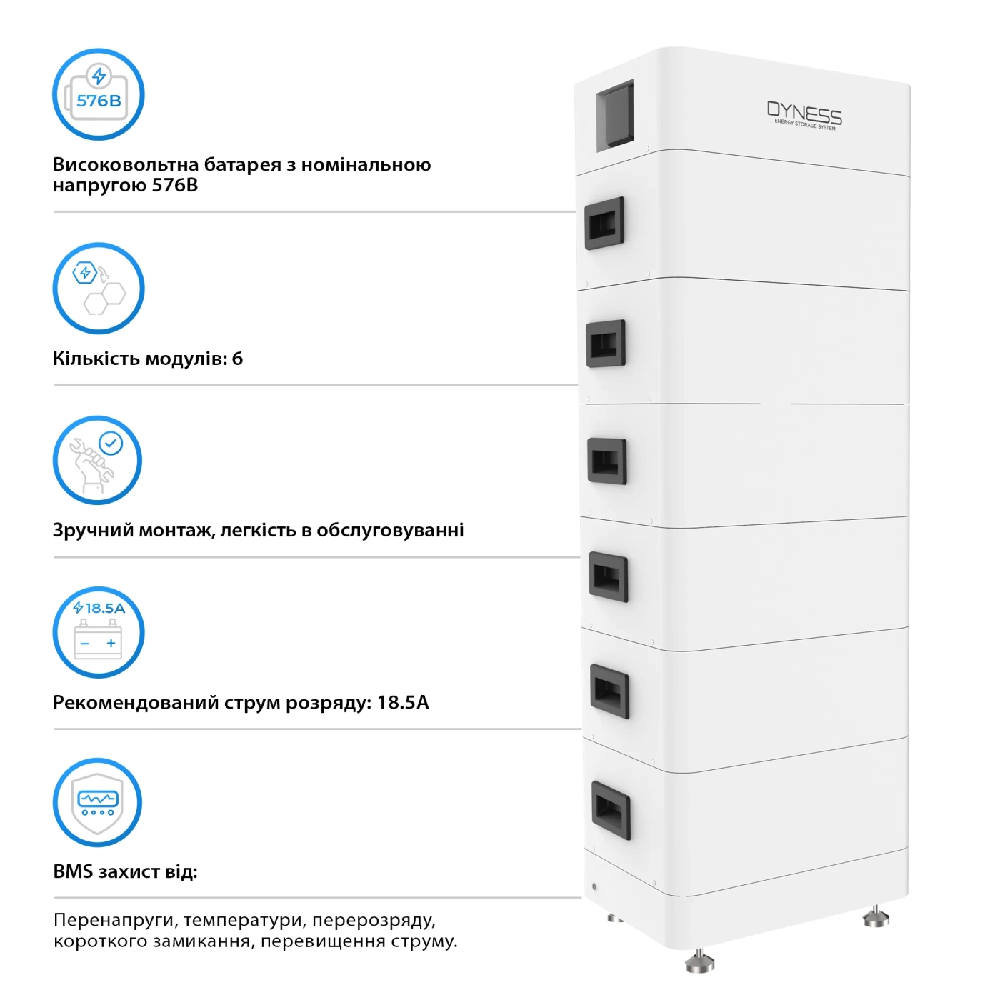 Блок батарей має рівень захисту IP65, що гарантує її безпечну роботу в умовах підвищеної вологості та пилу. Календарний термін служби акумуляторів складає 6000 циклів, що дає можливість використання системи протягом багатьох років без погіршення характеристик.