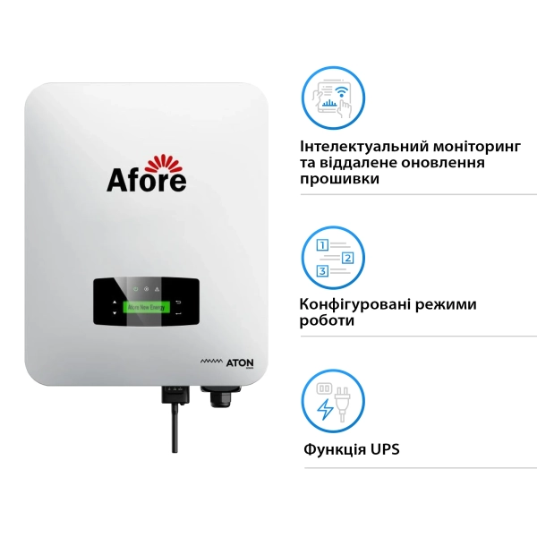 Важливою особливістю Afore Aton AF12K-MTH є підтримка функції UPS (безперебійного електропостачання). Час перемикання в аварійний режим становить менше 10 мс, що запобігає будь-яким збоям у роботі ваших приладів. Це особливо важливо для об'єктів із чутливим обладнанням, таких як серверні кімнати або медичні установи.