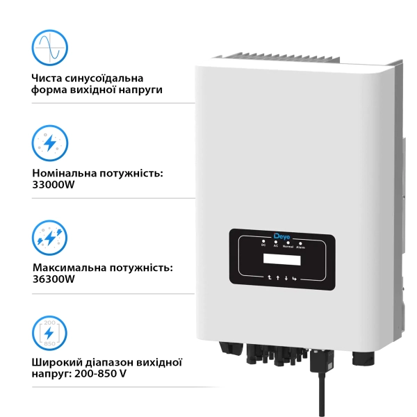 DEYE SUN-33K-G04 є передовим трифазним інвертором змінного струму в світі сонячних інверторів. Марка DEYE забезпечує надійність та високу якість, а модель SUN-33K-G04 вражає своїми технічними характеристиками.