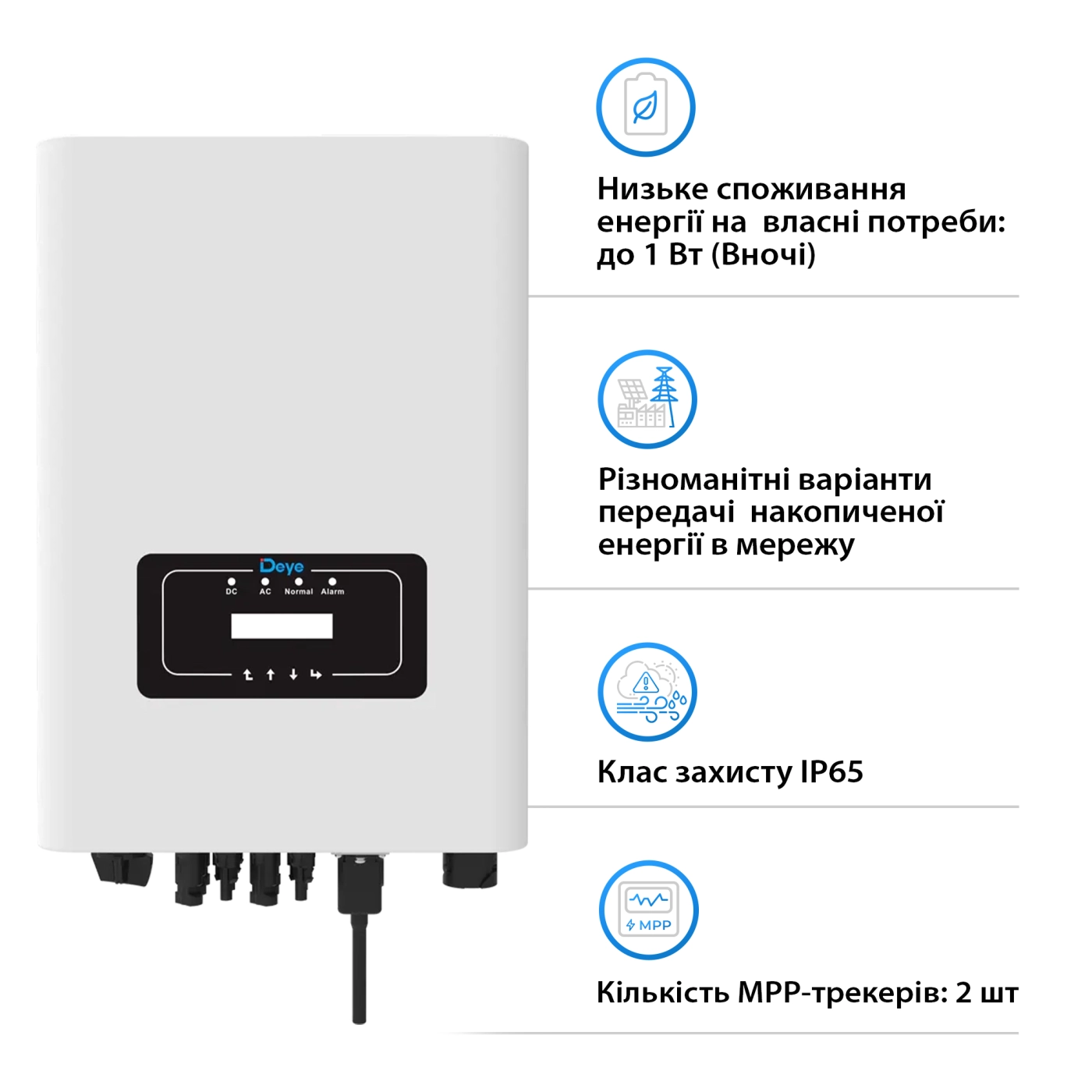 - Споживання на власні потреби – до 1 Вт (вночі)