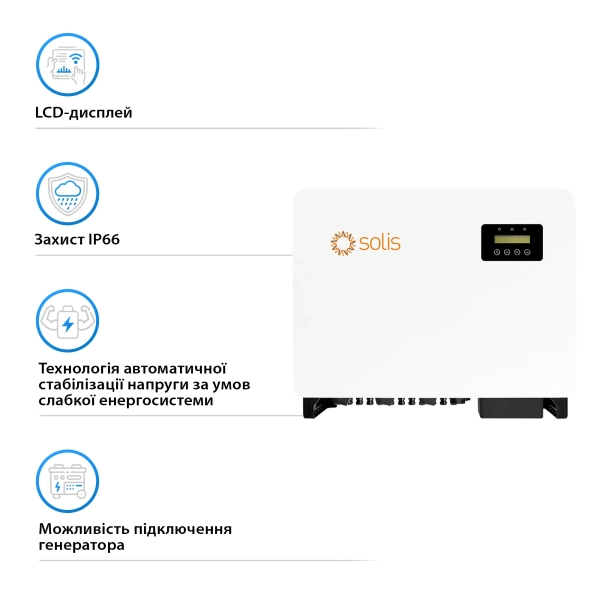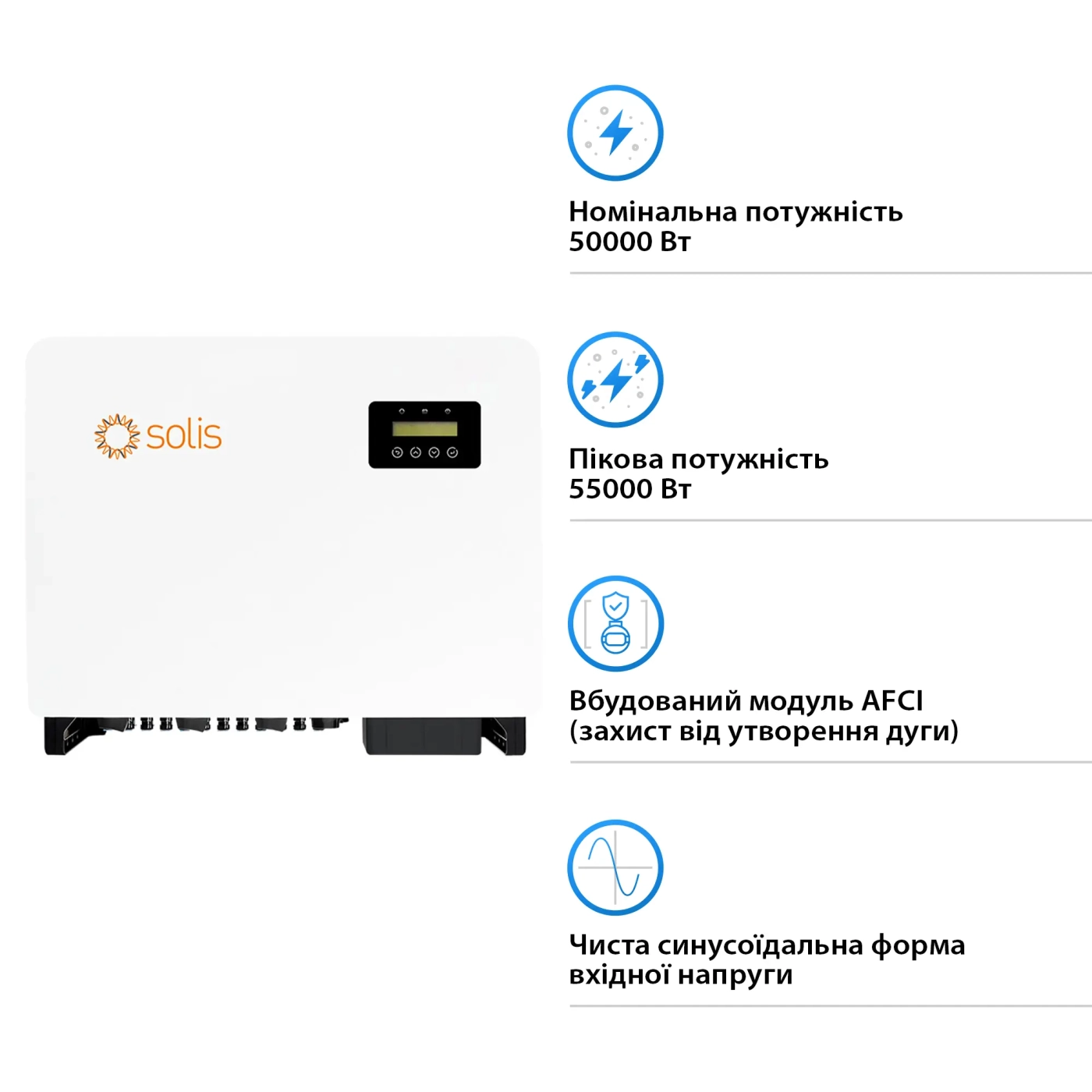 Інвертор Solis S5-GC50K має номінальну потужність 50 кВт та пікову потужність до 55 кВт. Його КПД досягає вражаючих 98,7%, що гарантує мінімальні втрати енергії та максимальну віддачу від сонячної установки.