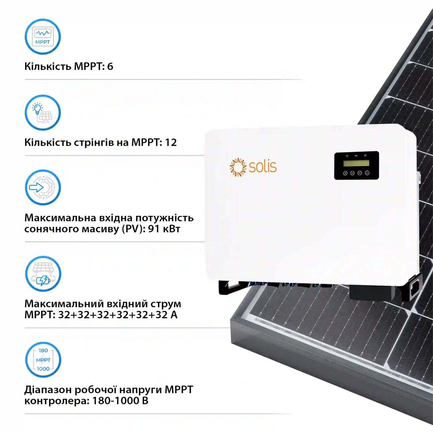 Інвертор підтримує 6 MPPT трекерів, що дозволяє ефективно використовувати сонячні панелі. Діапазон роботи MPPT контролера від 180 до 1000 V забезпечує гнучкість при підключенні різних сонячних систем. Максимальний вхідний струм – 32+32+32+32+32+32 A.
