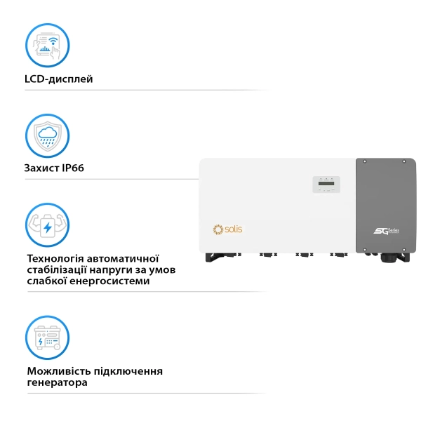 ККД інвертора досягає вражаючих 98,5%, що мінімізує втрати енергії та підвищує загальну ефективність системи. Можливість паралельного підключення дозволяє масштабувати систему в залежності від потреб. Ступінь захисту IP66 забезпечує стійкість до пилу та вологи, що робить інвертор ідеальним для експлуатації в будь-яких кліматичних умовах.