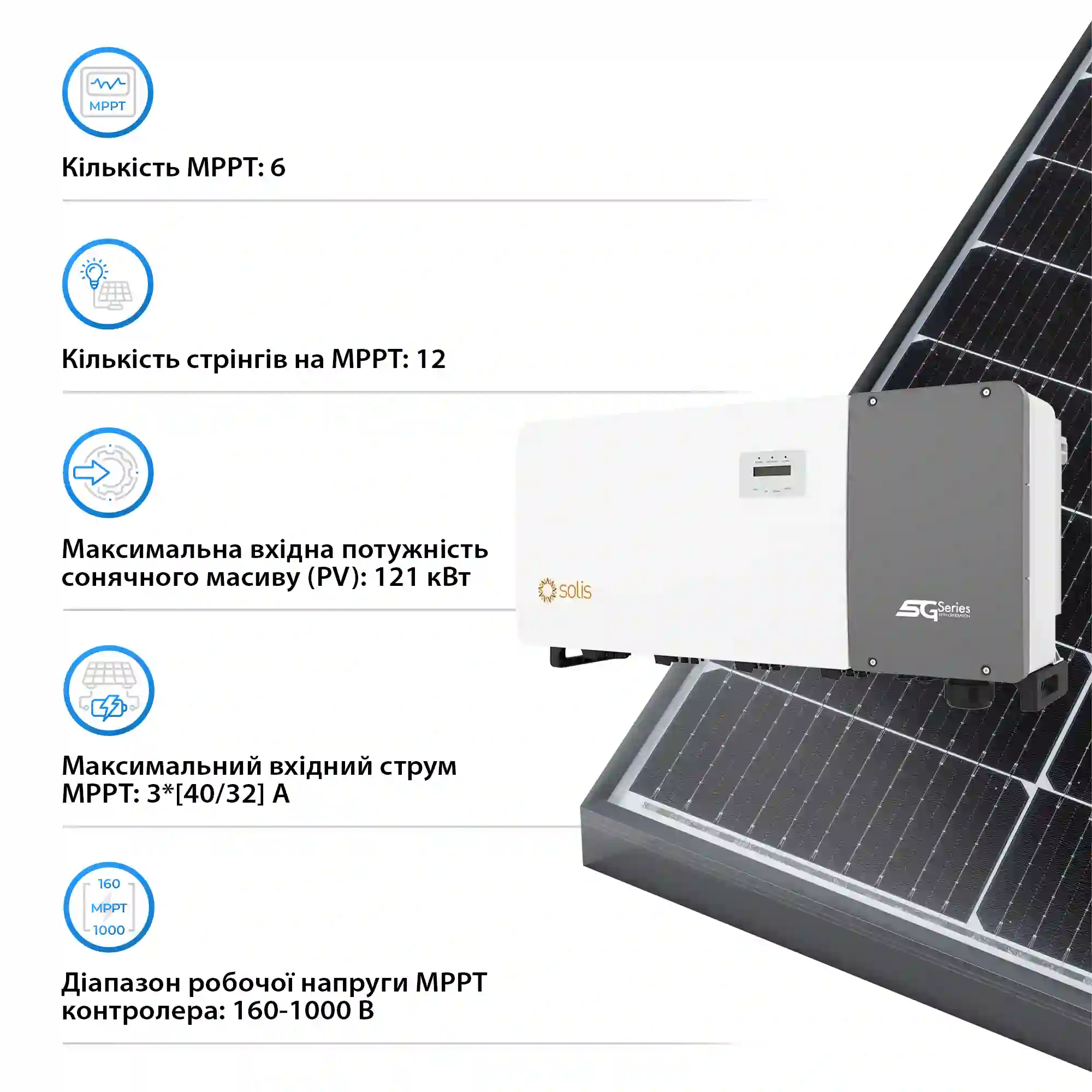 Модель Solis-80K-5G-PRO оснащена 6 MPPT трекерами, кожен з яких підтримує до 12 входів на 1 трекер. Діапазон роботи MPPT контролера складає від 160 до 1000 В, що дозволяє ефективно використовувати сонячні панелі з різними характеристиками. Максимальна вхідна потужність сонячного масиву досягає 104 кВтч, а максимальний вхідний струм сонячного поля PV становить 3[40/32] A*. Це забезпечує гнучкість та адаптивність системи до різних умов експлуатації.