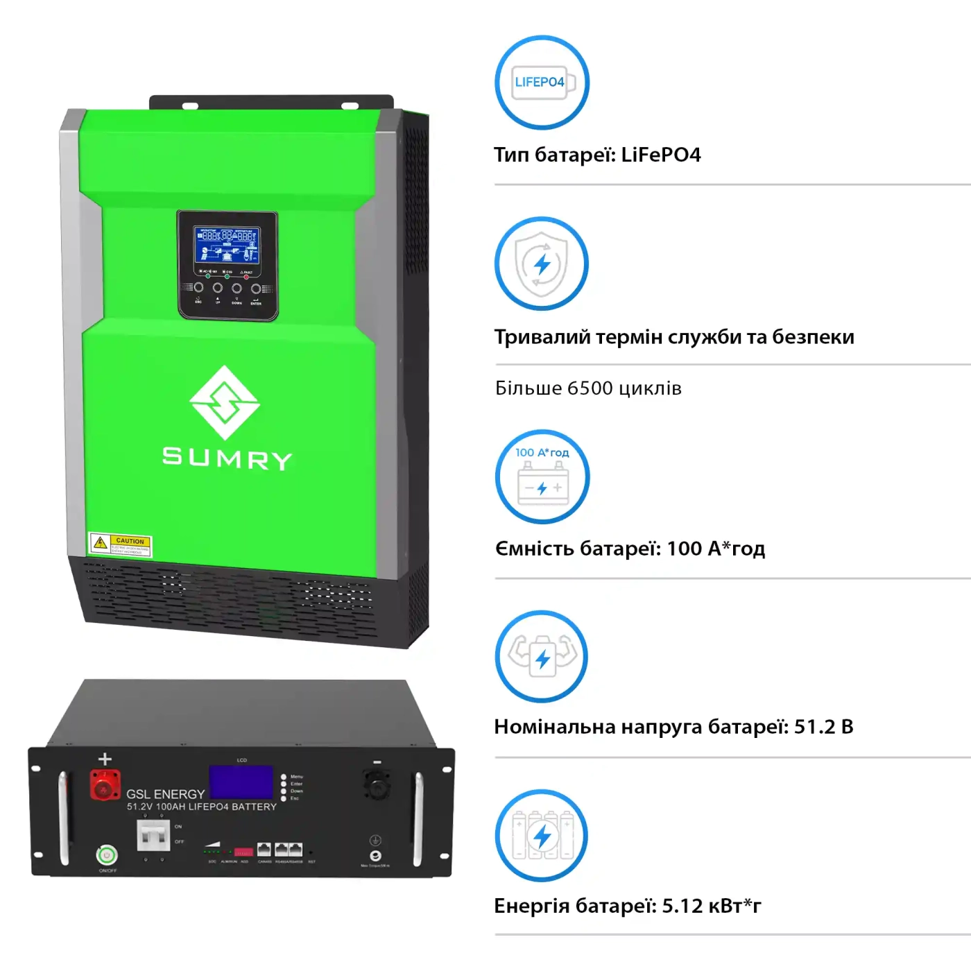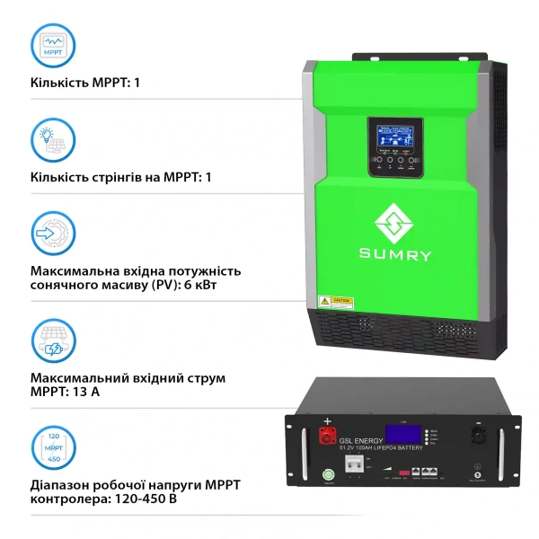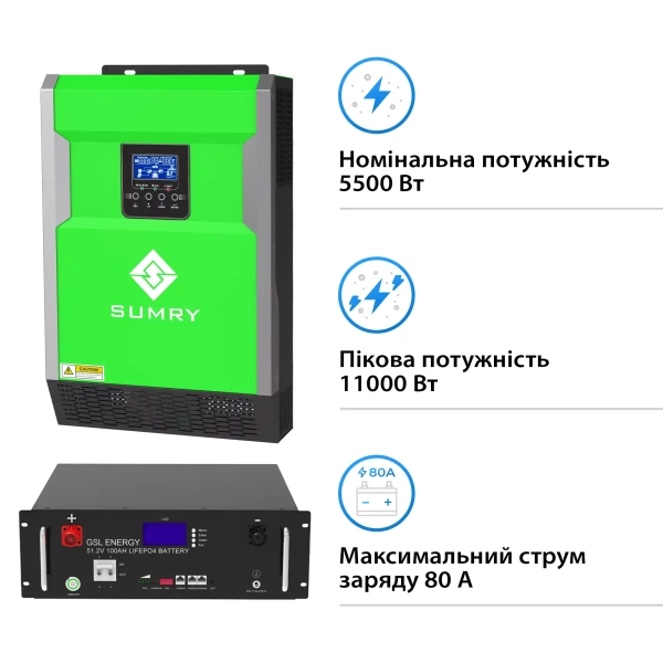 Система зберігання енергії Solarverse 5.5kW-Sumry 5.12kWh-GSL 1BAT LiFePO4 6500 циклів (SVR16-1SU5.5K2-LGS5.12K1-0)
