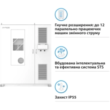 LiFePO4 з ресурсом до 6000 циклів зменшує сукупну вартість володіння у порівнянні з NMC-рішеннями. Рідинне охолодження з пасивними зонами вирівнює температуру комірок, знижуючи дерейтинг у спеку та ризики у холод. Три MPPT по 50 кВт розкривають потенціал неоднорідних фотополювань, а масштабування до 10 блоків дозволяє наростити потужність без зупинки процесу. Базовий захист IP55 (опційно IP65) плюс антикорозійна категорія — спокій на запилених, вологих та прибережних майданчиках.