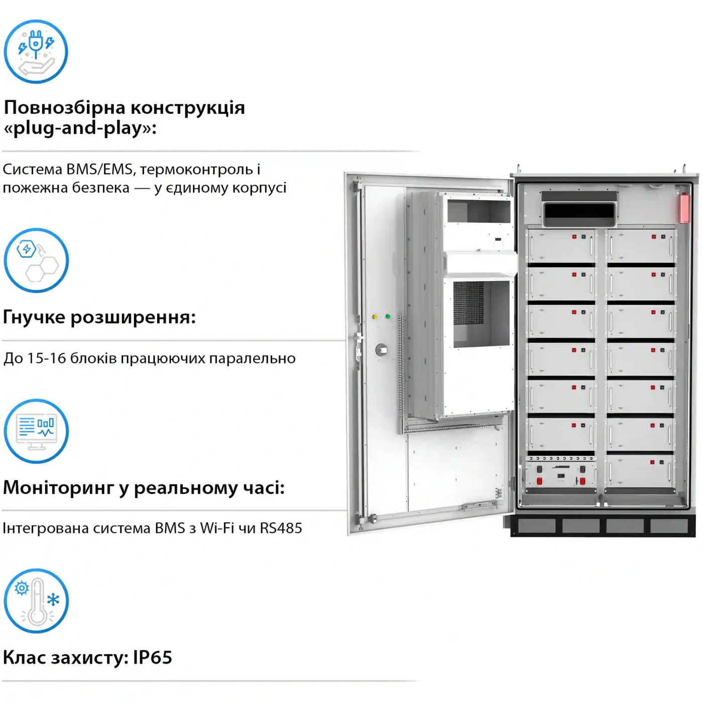 Інженерія тут підпорядкована практичній ефективності: герметичний корпус з IP65 надійно захищає від пилу й вологи, що критично для цехів і вуличної установки під навісом; клеми M8 спрощують монтаж; режими заряду/розряду та температурні діапазони підібрані для стійкості до реальних умов експлуатації. Базове охолодження — пасивне (для зниження ризиків і шуму); при проєктуванні об’єктів із підвищеним тепловим навантаженням можуть застосовуватись зовнішні рішення кондиціювання, а для вимог промислової безпеки — модулі аварійного відключення та пожежогасіння. У підсумку система надійно закриває завдання пікового шейвінгу, резервування й балансування власної генерації (у т.ч. від СЕС).