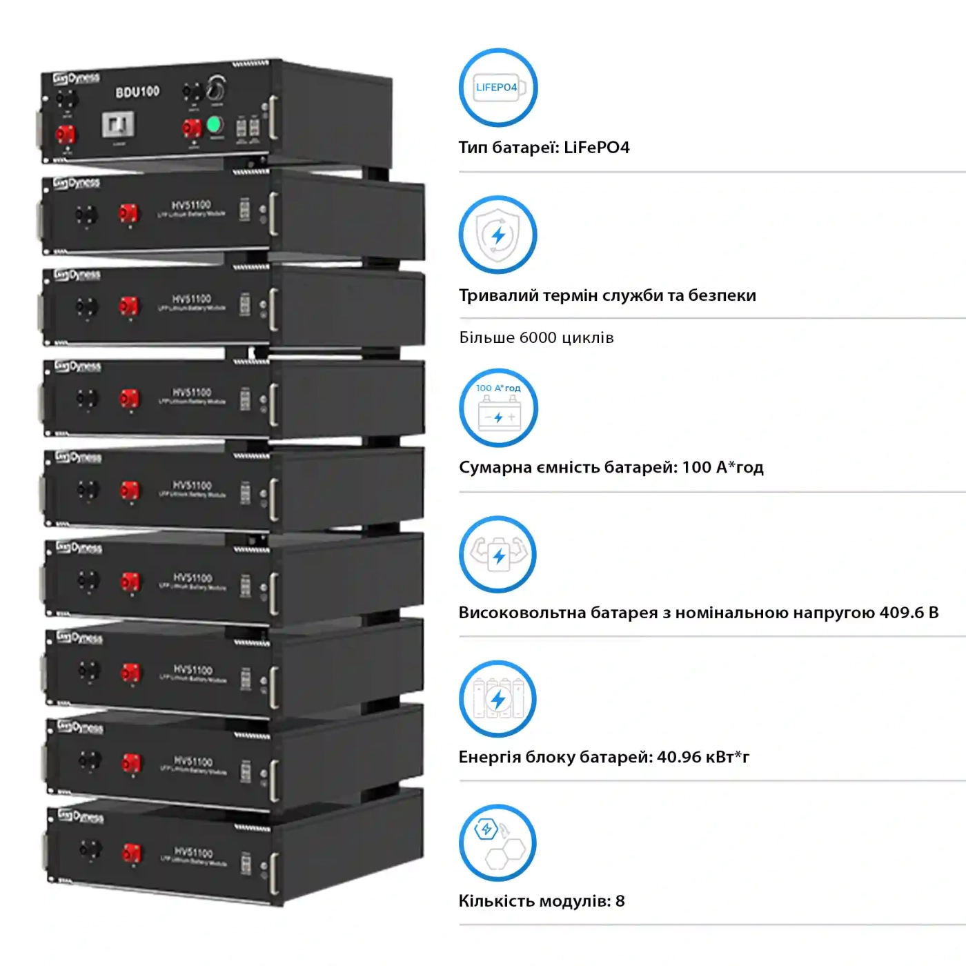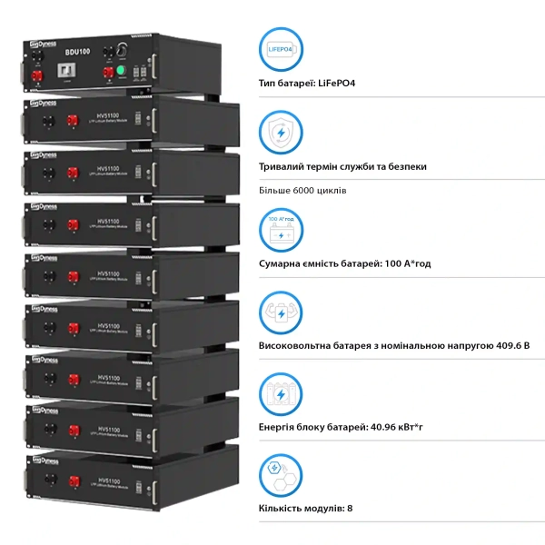 Система оснащена батареєю типу LiFePO4 (літій-залізо-фосфат) з ємністю 40,96 кВт⋅год. Високовольтна батарея забезпечує надійну роботу навіть у складних умовах. Термін служби – до 6000 циклів, що гарантує тривалий строк експлуатації та високу надійність. ⚙️🔋