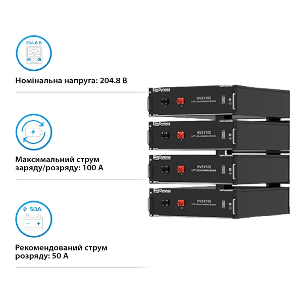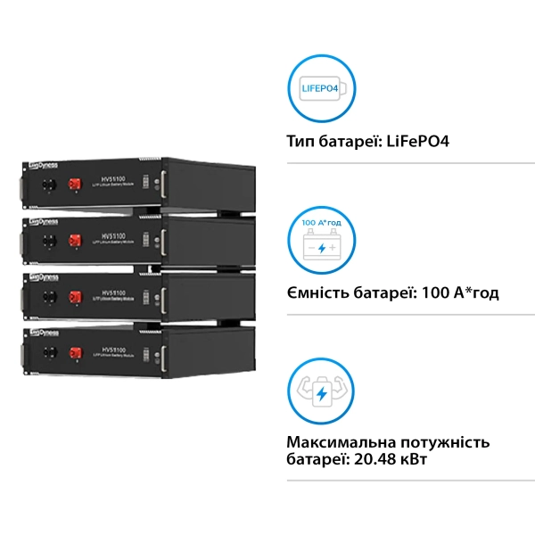 Комплектується система батареєю LiFePO4 HV51100-4-20.48kW, яка відома своїми довговічними якостями та здатністю до 6000 циклів зарядки/розрядки без значної втрати ємності. Батарея забезпечує надійне зберігання енергії, що дозволяє використовувати її в періоди відсутності генерації або підвищеного споживання.