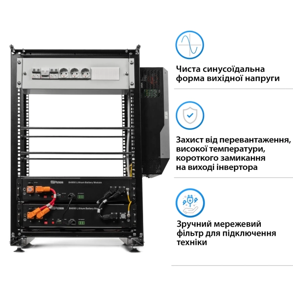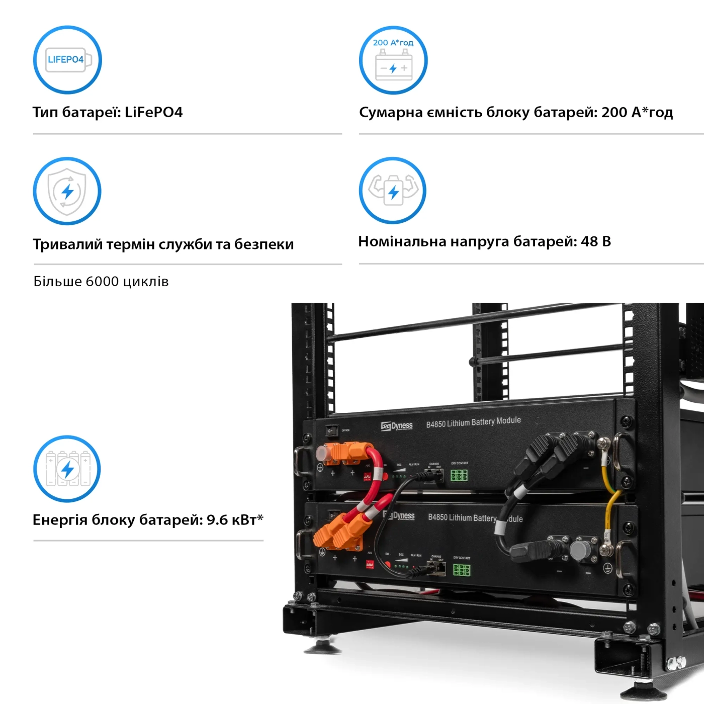 Комплект включає чотири батареї LiFePO4, кожна з яких має ємність 200 Ah і здатна зберігати до 9.6 kWh енергії. Цей тип батарей відрізняється високою надійністю і довговічністю – вони здатні витримувати до 6000 циклів зарядки і розрядки. Номінальна напруга батарей становить 48 V, що забезпечує стабільну роботу всієї системи.