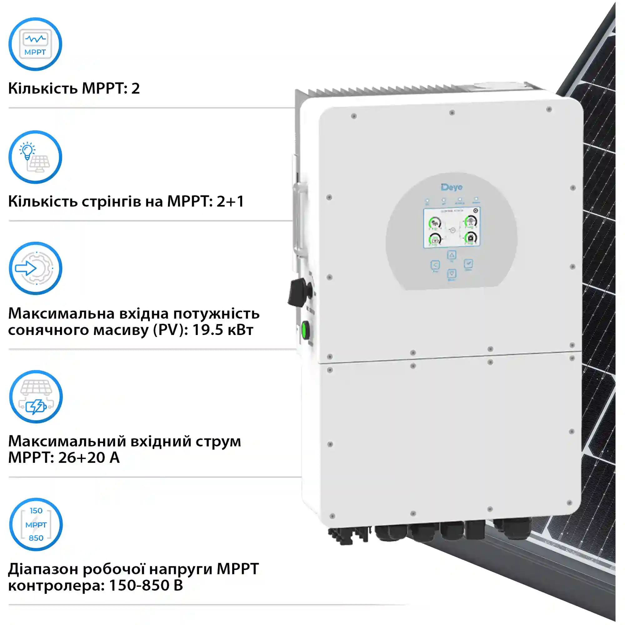 Інвертор SUN-15K-SG01HP3-EU-AM2 — це мозок системи, який керує усім з точністю до секунди. Два MPPT-контролери відслідковують максимальну точку потужності сонячних панелей, а можливість підключення масиву до 19,5 кВт дозволяє використовувати максимум енергії. Захист IP65 забезпечує безпечну установку як у приміщенні, так і на вулиці. 6 програмованих часових інтервалів для зарядки/розрядки та підтримка роботи з акумуляторами Deye забезпечують точну адаптацію під ваші потреби. Кожен елемент системи працює на ефективність, економію та незалежність.