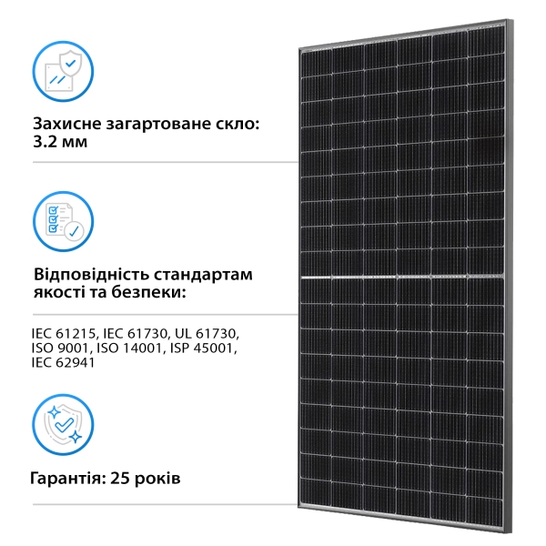 Захисна поверхня панелі, що складається з 3.2-міліметрового закаленого скла, разом з анодованим алюмінієвим каркасом, забезпечує надійний захист монокристалічних пластин від пошкоджень. Низький рівень нагрівання елементів сприяє підвищенню продуктивності всієї системи, дозволяючи будувати високоефективні сонячні установки з напругою Vmp 30.88 В і струмом Imp 13.28 А.