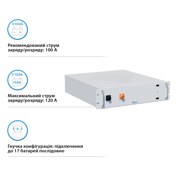 В отличие от традиционных аккумуляторов, Deye BOS-G PRO использует катодный материал из литий-железо-фосфата (LiFePO4), который обеспечивает высокую степень безопасности и длительный срок службы. Батарея обладает низким саморазрядом, отсутствием эффекта памяти и отличными показателями при неглубоких циклах заряда и разряда. Это означает, что вы получаете надежный источник энергии, способный прослужить многие годы без значительной потери емкости.