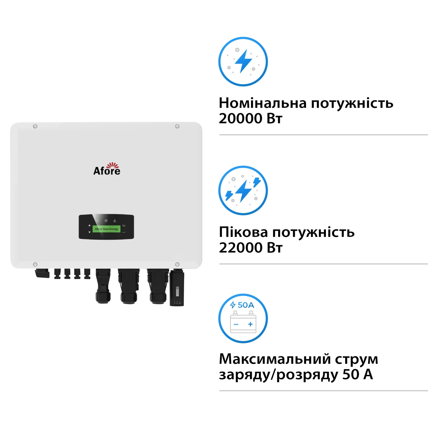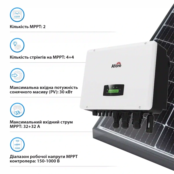 Afore AF20K-TH-1DY42.6K-LFP оснащена гибридным инвертором мощностью 20 000 Вт, который поддерживает трехфазное подключение. Благодаря наличию двух MPPT трекеров вы можете оптимально разместить солнечные панели на разных плоскостях, что обеспечит максимальную производительность системы. Мощность солнечного массива составляет до 30 кВт — это отличный показатель для поддержки значительных энергетических потребностей.