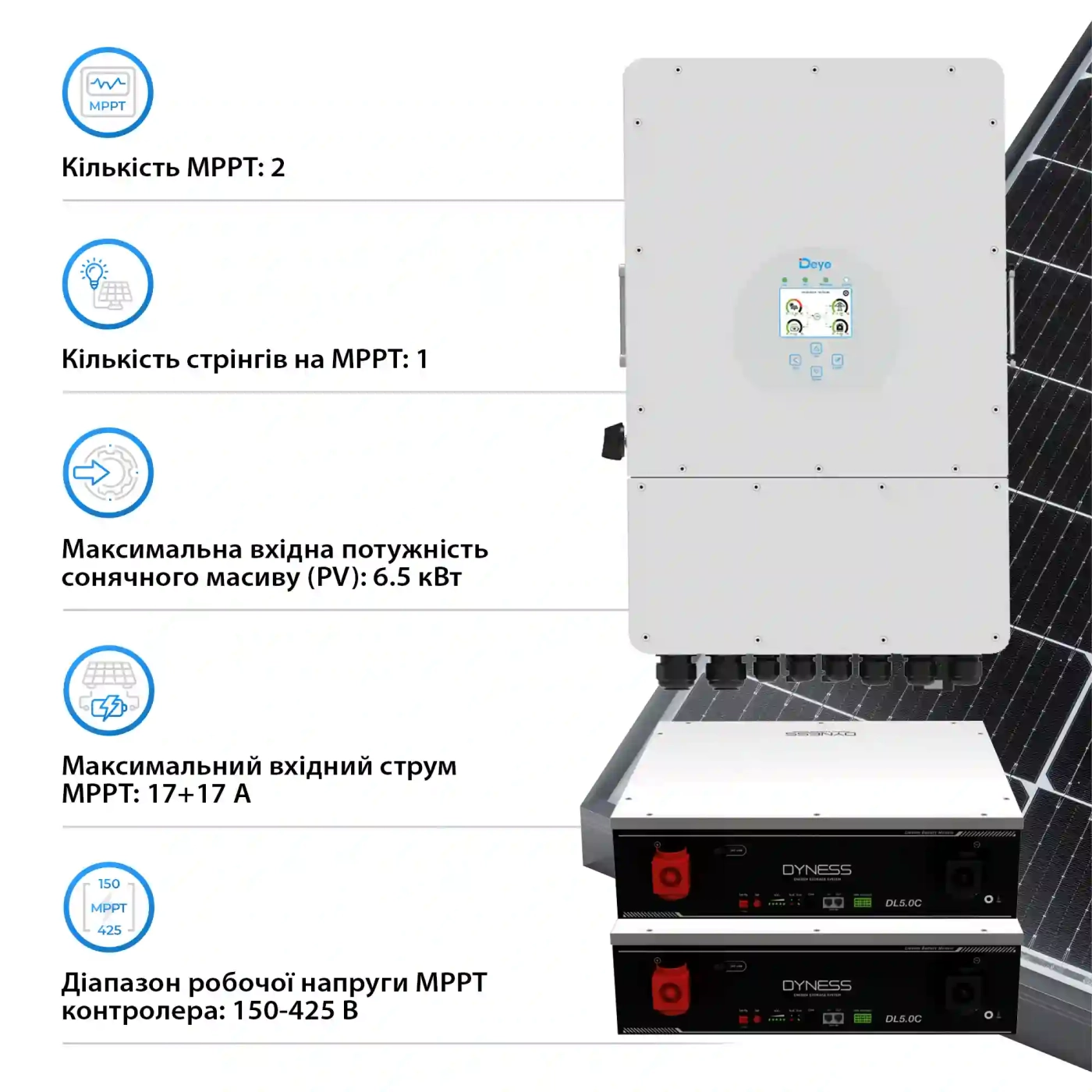 Система включает инверторный блок и две высококачественные батареи DL5.0C типа LiFePO4. Эти батареи имеют суммарную емкость 200 Ah и могут хранить до 10.24 кВтч энергии, обеспечивая длительную автономную работу даже в условиях повышенной нагрузки. Кроме того, инвертор оснащен двумя MPPT-контроллерами, что позволяет оптимально использовать мощность солнечных панелей.