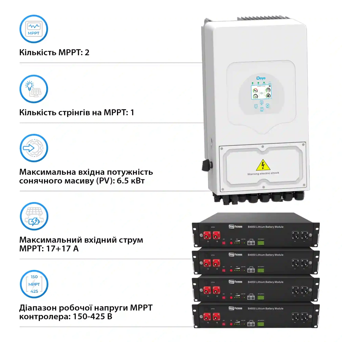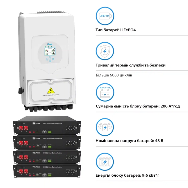 Система хранения энергии Solarverse 5kW-DEYE 9.6kWh-Dyness 4BAT LiFePO4 6000 циклов (SVR24-1DE5K1-LDY9.6K1-0) : Надежность и инновации в одном комплекте