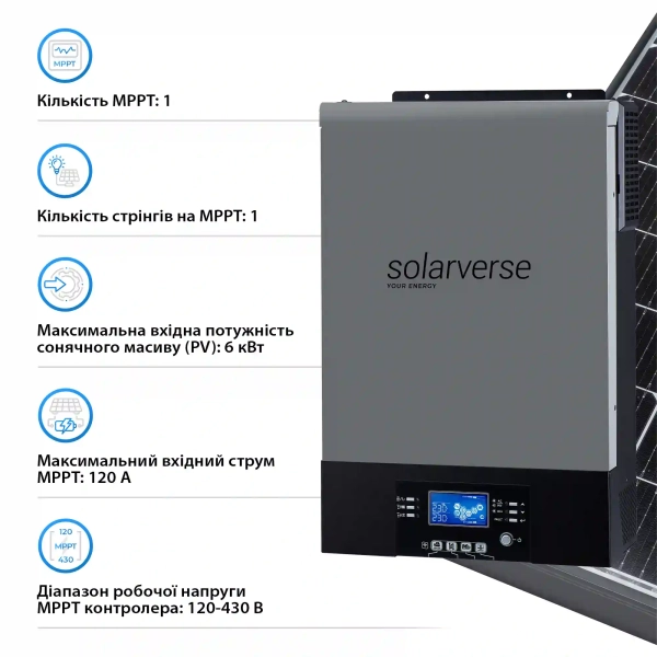 Автономний інвертор Solarverse Ampere UPS 6kW 48V 1 MPPT Wi-Fi 220V (SV6048UPSW) – це високоякісне обладнання для сонячних енергетичних систем, призначене для забезпечення надійного та ефективного перетворення енергії. Цей інвертор ідеально підходить для використання в приватних будинках і малих комерційних об'єктах, де необхідне стабільне та ефективне енергозабезпечення.