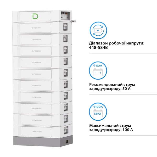 Блок Dyness STACK100 має номінальну ємність 100 Ah. Це забезпечить стабільну роботу вашого обладнання протягом тривалого часу, навіть при великих навантаженнях. Максимальна потужність батареї становить 51,2 kW, що дозволяє ефективно використовувати її для великих енергетичних установок.