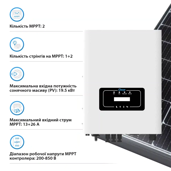 Цей інвертор обладнаний двома МРРТ трекерами, що дозволяє максимально ефективно використовувати сонячні панелі, навіть при наявності частково затінених ділянок. Діапазон роботи MPPT-контролера від 200 до 850 В робить інвертор універсальним для різних сонячних масивів. Вбудований захист IP65 гарантує довговічність та стабільну роботу пристрою в складних погодних умовах, включаючи екстремальні температури від -25°C до +60°C.