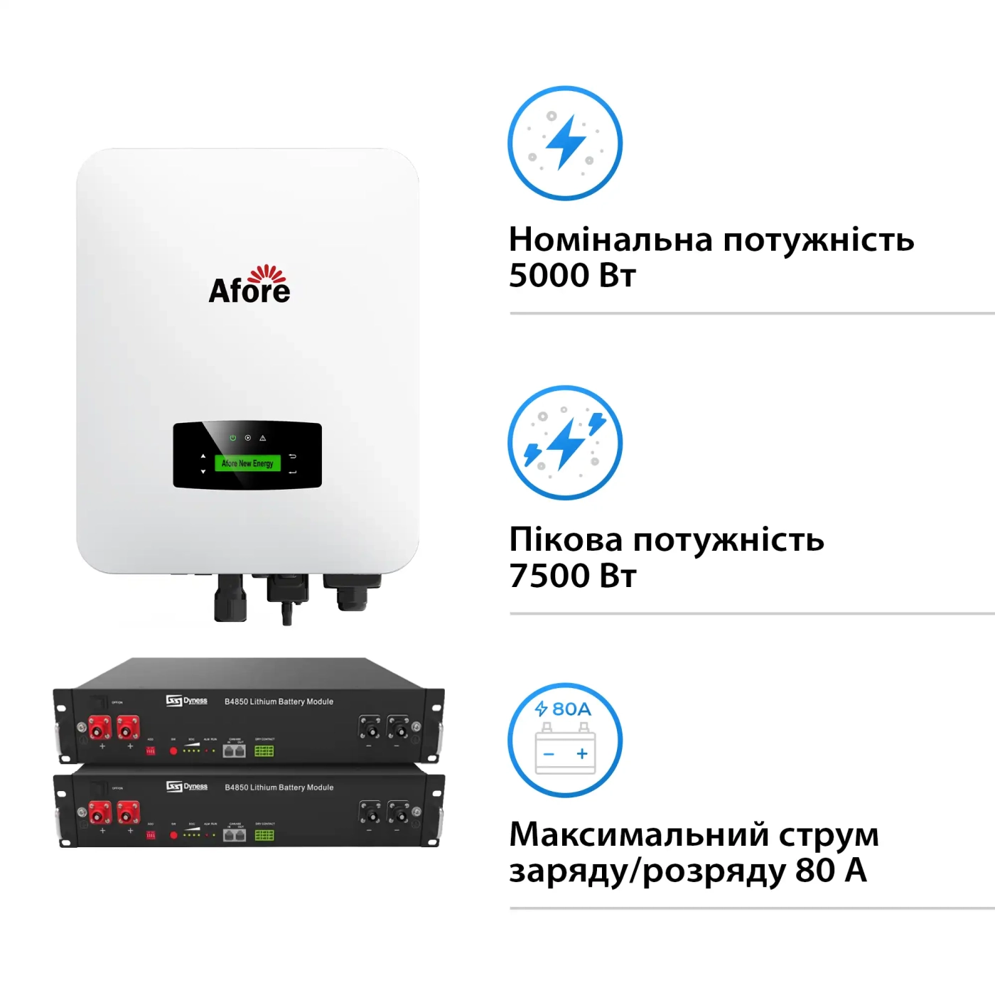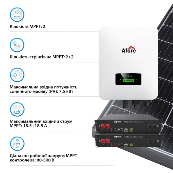Інвертор Afore AF5K-SL: Серцем системи є гібридний інвертор AF5K-SL, що забезпечує стабільну роботу та високу продуктивність. Він підтримує однофазне підключення і має номінальну потужність 5000 Вт, що ідеально підходить для більшості побутових потреб.