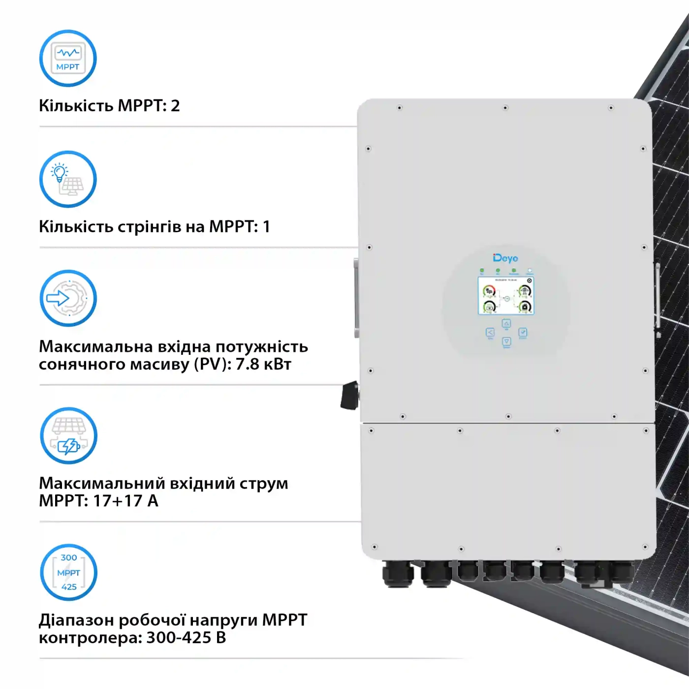 - Максимальна вхідна потужність PV (сонячного масиву): 7,8 кВт
