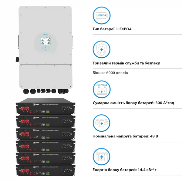 Система зберігання енергії Deye SUN-6K-SG03LP1-EU-6DY14.4K-LFP 6kW 14.4kWh 6BAT LiFePO4 6000 циклів