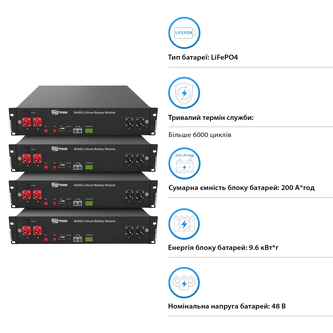Батареї типу LiFePO4 із загальною сумарною ємністю 200 Ah та енергією 9.6 кВт·год забезпечать тривале зберігання та подачу енергії. Це дозволяє системі стабільно працювати при високих навантаженнях, а цикл заряду-розряду становить до 6000 циклів, що гарантує тривалий термін служби та надійність.