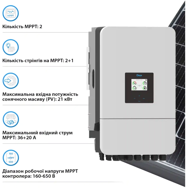 У системі Solarverse продумано все: від трансформаторної ізоляції до 6 індивідуальних часових вікон заряду та розряду. Інвертор підтримує 100% несиметричне навантаження по фазах, а також може працювати паралельно з іншими системами й дизельними генераторами. Максимальний струм заряду — 260 А, що дозволяє швидко поповнити резерв з будь-якого джерела живлення. Компактні розміри, надійні комплектуючі та інтелектуальне керування перетворюють цей комплект на серце вашої енергетичної інфраструктури.