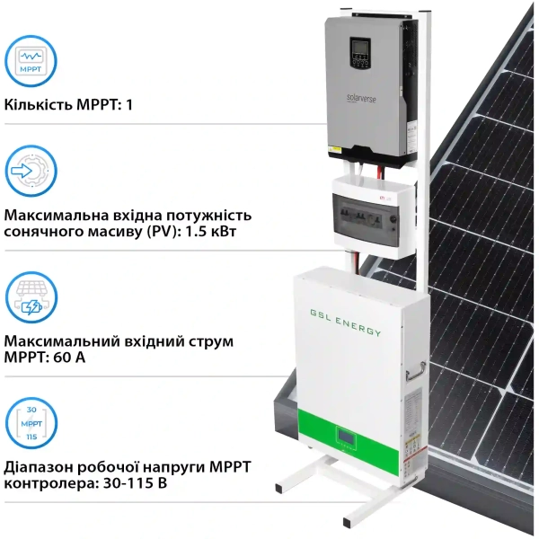 Там, де свинцево-кислотні АКБ здаються, LiFePO4 (GSL025200A-B-GBP2) тримає темп: до 6500 циклів з мінімальною деградацією. Це роки служби без постійної заміни батарей. У порівнянні з генераторами — жодних черг за пальним, вихлопів і шуму: Solarverse працює тихо й екологічно. А вбудований MPPT-контролер (1 трекер, вхід PV до 1.5 кВт) перетворює сонячну погоду на економію: вдень панелі підживлюють батарею й зменшують рахунки, а вночі ви раціонально використовуєте накопичене.