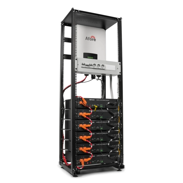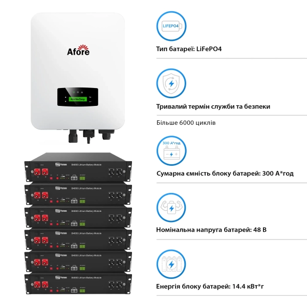 Система включає в себе один інверторний блок моделі AF6K-SLP та шість батарей B4850 типу LiFePO4, що забезпечує надійну та довговічну роботу. Інвертор гібридного типу з номінальною потужністю 6000 W та двома MPPT забезпечує оптимізацію роботи сонячних панелей та максимальну вхідну потужність до 9 kW.