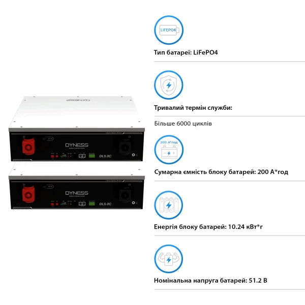 Акумулятори LiFePO4 мають тривалий термін служби – до 6000 циклів, що гарантує довготривалу експлуатацію та надійне електропостачання на багато років. Номінальна напруга 51,2 В і можливість роботи в режимі резервного живлення роблять систему ідеальним рішенням для резервного електропостачання.