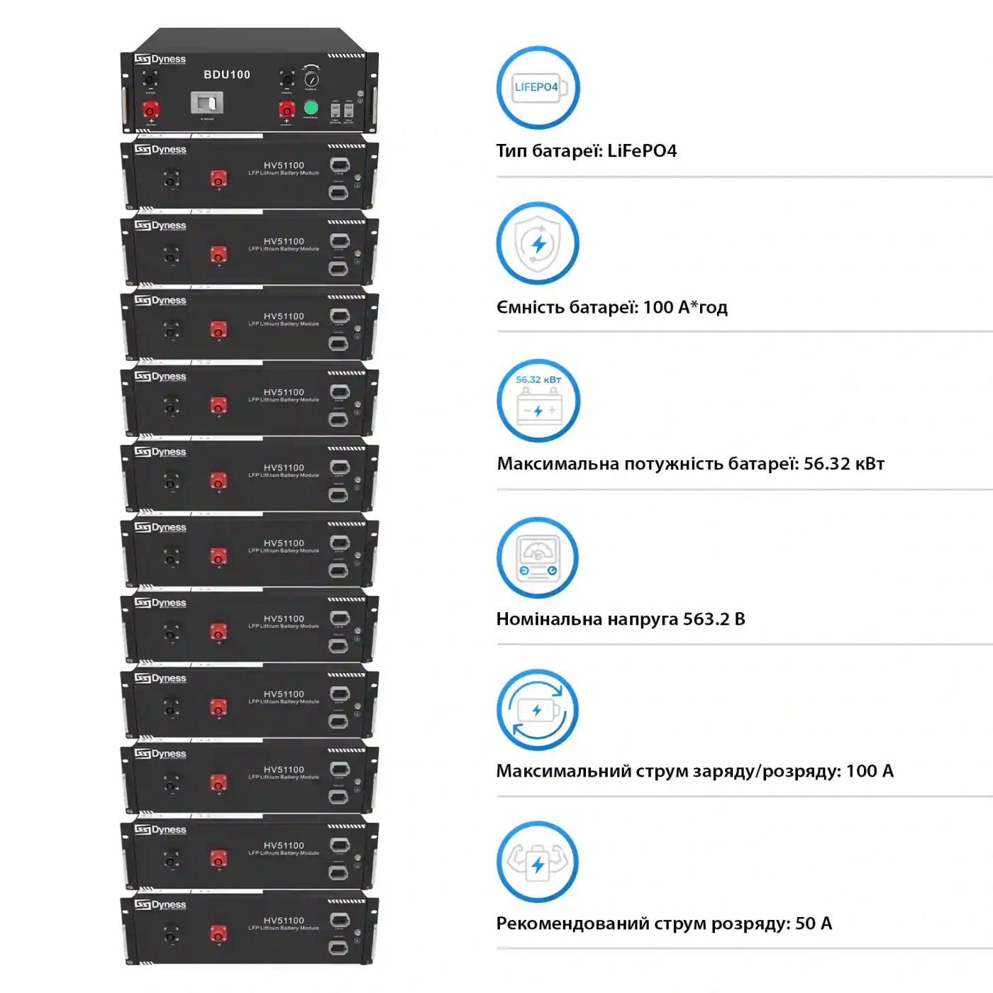 Блок батарей, включений у систему, має сумарну ємність 100 А·год і здатний зберігати до 56,32 кВт·год енергії. Батарея HV51100-11-56.32kW виконана на основі технології LiFePO4, що гарантує тривалий термін служби та високу надійність. Середній життєвий цикл становить до 6000 циклів, що дозволяє використовувати систему багато років без значних втрат ємності.