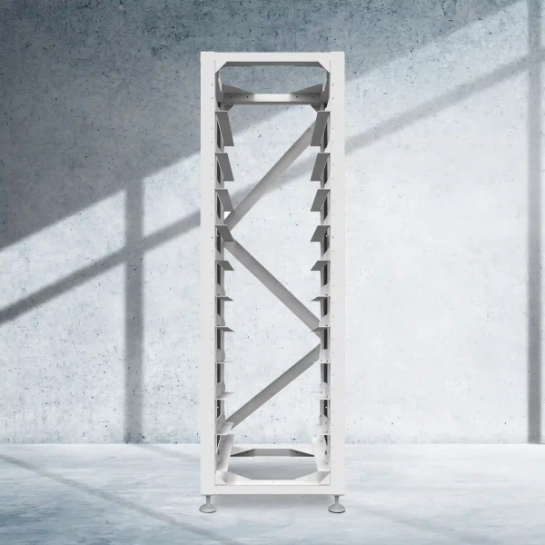 Конструкція стійки виконана з міцного металу, що гарантує тривалий термін служби та стійкість до механічних пошкоджень. Колір стійки — класичний білий, який легко впишеться в будь-який інтер’єр, не привертаючи зайвої уваги. Стійка має 11 рівнів, що дозволяє розмістити велику кількість батарей на одному рівні. Це ідеальний вибір для встановлення в домашніх та промислових сонячних системах.