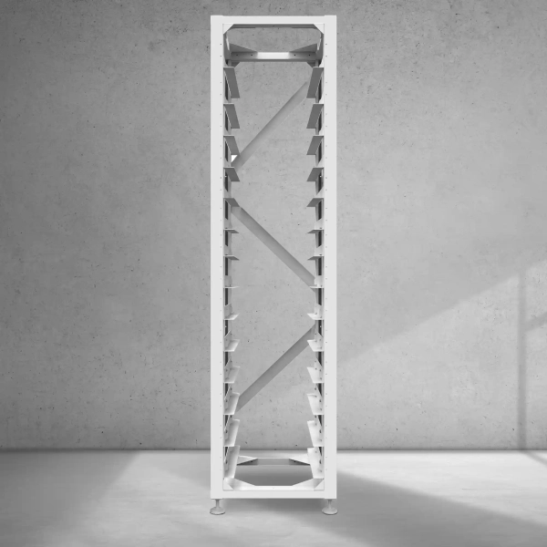 Конструкція стійки виконана з металу, що гарантує високу міцність та стійкість до зовнішніх впливів. Білий колір дозволяє інтегрувати стійку в будь-який інтер'єр, а також легко підтримувати чистоту.