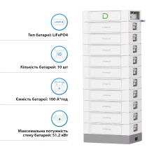 Блок батарей Dyness STACK100 — це високоякісна та надійна акумуляторна система на базі літій-залізо-фосфатних (LiFePO4) елементів. Цей акумуляторний модуль ідеально підходить для використання в різних енергетичних системах: від сонячних станцій до зарядних станцій та інших об'єктів з високими вимогами до потужності та довговічності.