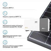 Інвертор обладнаний 16 входами на один MPPT трекер та підтримує максимальну вхідну потужність сонячної системи до 130 кВтч. Час перемикання всього 10 мс забезпечує швидку реакцію системи на зміни навантаження.