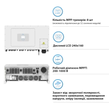 Інвертор оснащений 8 MPPT-трекерами, що забезпечує ефективне керування різними групами сонячних панелей та максимізує вихідну потужність усієї системи. Додаткові функції, включаючи захист від зворотної полярності, короткого замикання, перенапруги та інші, забезпечують безпечну роботу за будь-яких умов.