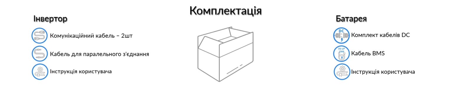 Цей комплект легко масштабується: можливе паралельне підключення до 6 інверторів для створення потужної системи до 33 кВт. Також є можливість об'єднання в трьохфазну систему для задоволення потреб вашого будинку чи офісу.
