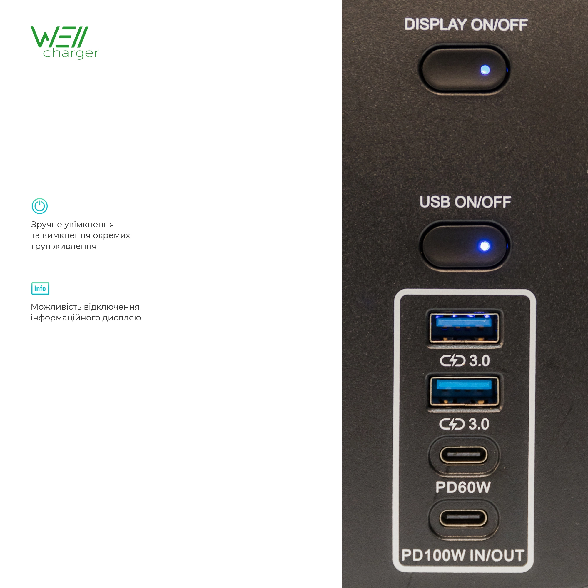 - Зручне керування та інформативний дисплей: Інтуїтивне керування та інформативний дисплей забезпечують легкість у використанні. Ви можете вимкнути групи живлення, які не використовуються, заощаджуючи енергію.