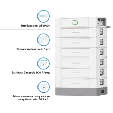 Эта модель включает в себя 6 литий-железо-фосфатных аккумуляторов LiFePO4 с номинальной емкостью 100 Ah каждый. Общая энергоемкость системы составляет 30.7 kW⋅h, что позволяет обеспечивать длительное и стабильное энергоснабжение для самых различных нужд.