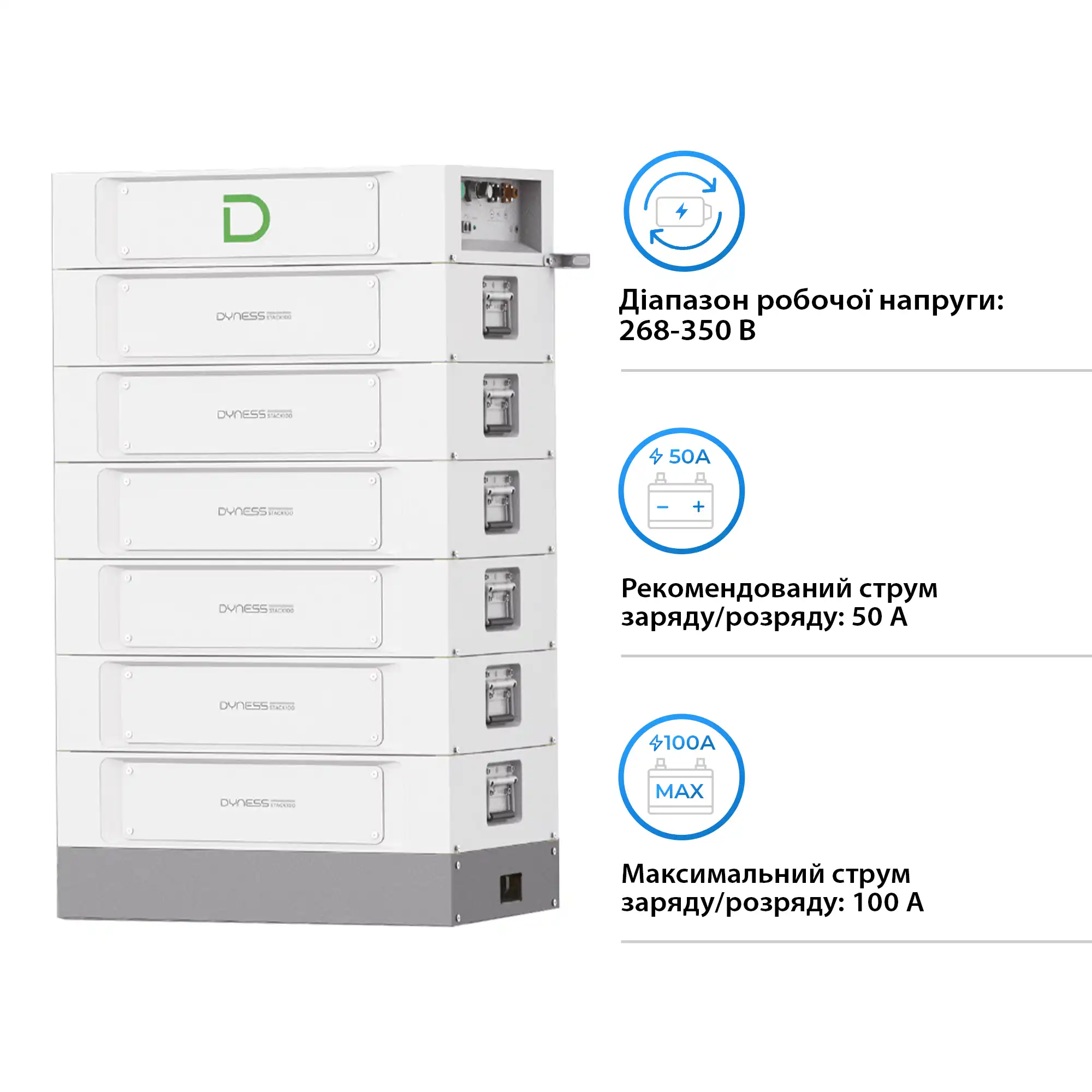 Процесс зарядки осуществляется при напряжении 350 V, при этом максимальный зарядный ток составляет 100 A. Для оптимальной работы рекомендуется соблюдать ток разряда до 50 A. Такое сочетание мощности и технологических решений делает блок батарей Dyness идеальным для масштабных энергетических решений, будь то для частных домов, коммерческих объектов или промышленного использования.
