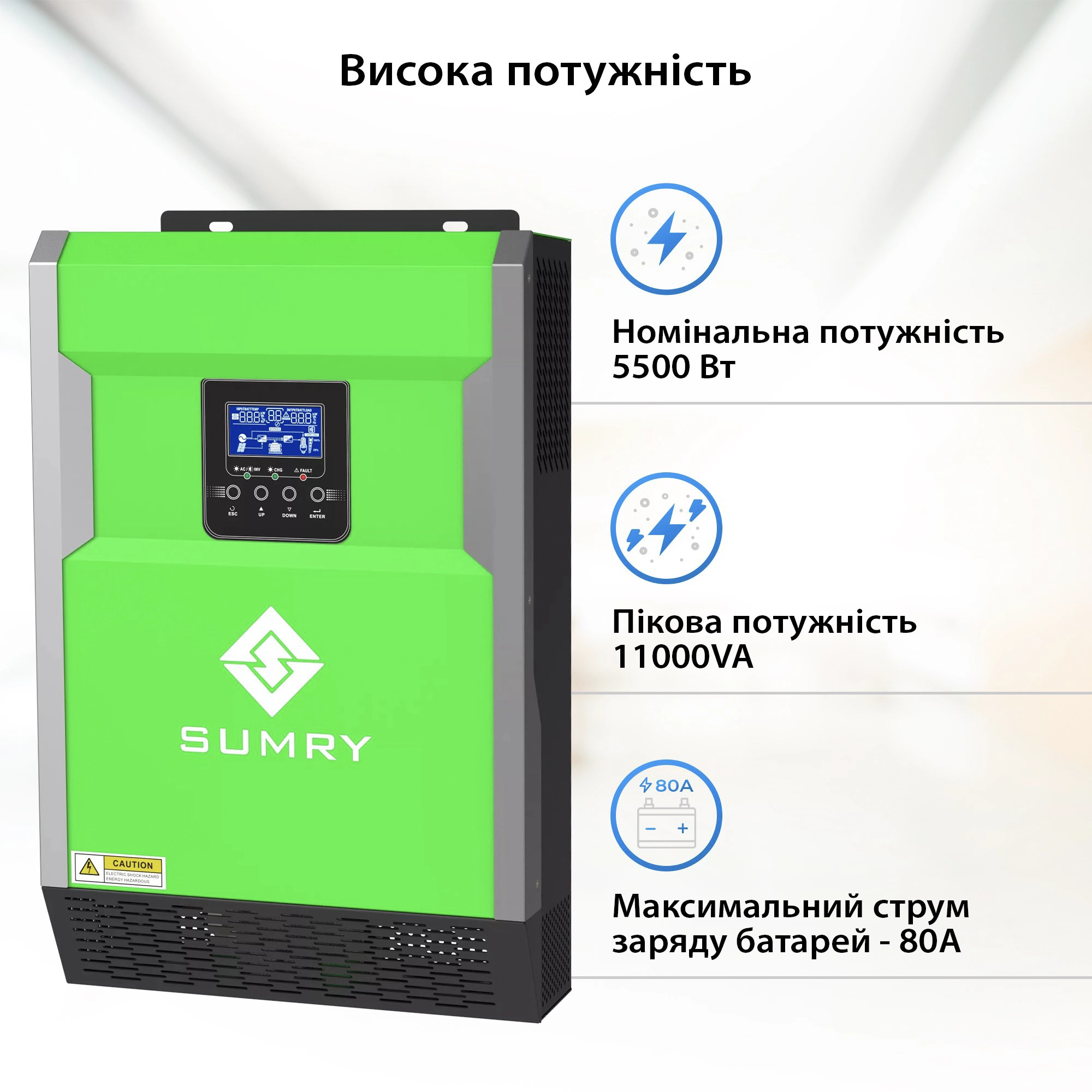SUMRY HGP-5500W-2DY9.6K-LFP-W обладает высокими показателями надежности и безопасности. Применение LiFePO4 батарей гарантирует устойчивость к температурным колебаниям и механическим воздействиям, что обеспечивает долгий срок службы и стабильную работу системы. Дополнительные функции, такие как защита от перегрузок и коротких замыканий, делают её безопасной в использовании.