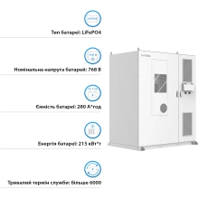 LiFePO4 (литий-железо-фосфат) обеспечивает повышенную термостабильность и длинный жизненный цикл при интенсивной эксплуатации. Номинальные параметры: 786 В, 280 А·ч, 100 кВт непрерывной мощности (до 100 кВт пик), рабочий диапазон напряжения 672–864 В, рекомендованные токи заряда и разряда — по 140 А. Активное охлаждение и промышленный кондиционер поддерживают оптимальную температуру при заряде от 0 до +50 °C и разряде от −20 до +50 °C, что критично для сохранения ресурса. Корпус из металла с пылевлагозащитой IP55 (опция IP65 для жёстких условий) гарантирует работу на открытых площадках и в производственных помещениях. Для безопасности предусмотрена трёхуровневая система пожарной защиты с встроенным огнетушащим контуром, интеллектуальная BMS/EMS с точной телеметрией, а также болтовые клеммы и медные шины для надёжной коммутации.