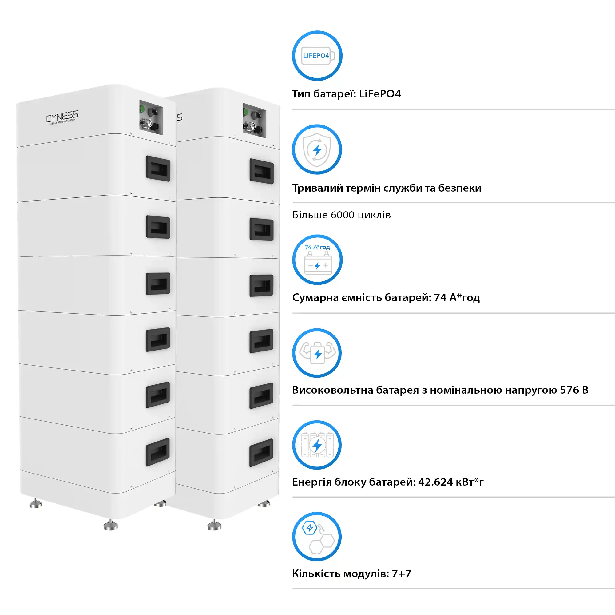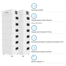 Система оснащена двумя батареями типа LiFePO4, которые обеспечивают суммарную емкость 74 А·ч. Этот тип батарей отличается высокой степенью безопасности и долговечности. Количество циклов зарядки и разрядки – 6000, что обеспечивает более 15 лет эксплуатации. Благодаря этому, система идеально подходит для долгосрочных инвестиций в энергетическую независимость.