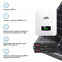 Максимальная входная мощность PV: Система поддерживает подключение солнечных панелей с общей мощностью до 7.5 кВт, что позволяет эффективно использовать возобновляемые источники энергии.