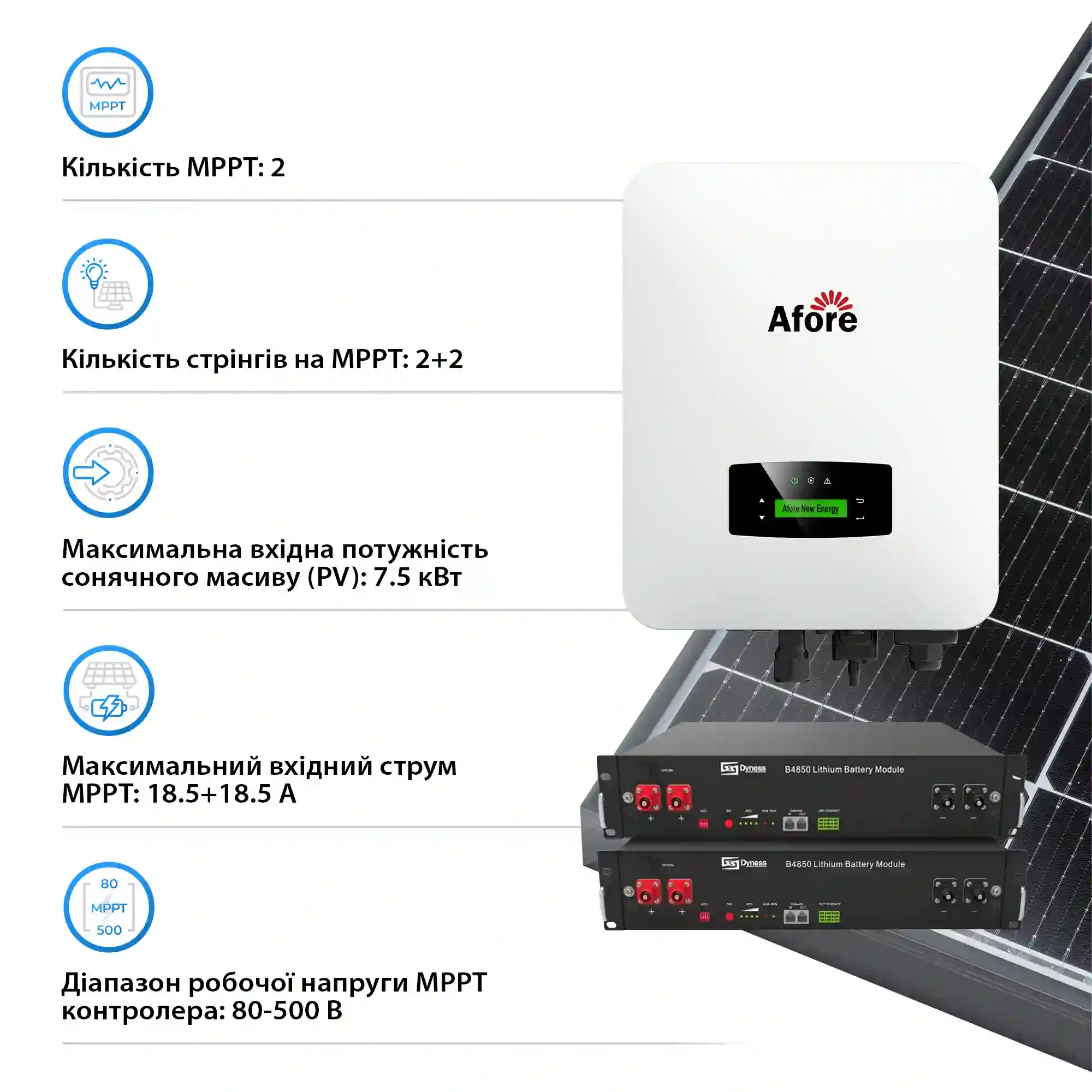 Инвертор Afore AF5K-SL: Сердцем системы является гибридный инвертор AF5K-SL, обеспечивающий стабильную работу и высокую производительность. Он поддерживает однофазное подключение и обладает номинальной мощностью 5000 Вт, что идеально подходит для большинства бытовых нужд.