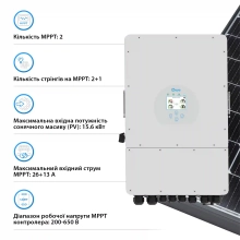 Гибридный инвертор: Инвертор SUN-12K-SG04LP3-EU поддерживает работу в гибридном режиме, что позволяет эффективно использовать энергию как от солнечных панелей, так и от сети. Два MPPT обеспечивают максимальную производительность солнечного массива мощностью до 15,6 кВт.