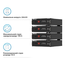 Комплектуется система батареей LiFePO4 HV51100-4-20.48kW, которая известна своими долговечными качествами и способностью к 6000 циклам зарядки/разрядки без значительной потери емкости. Батарея обеспечивает надежное хранение энергии, позволяя использовать ее в периоды отсутствия генерации или повышенного потребления.